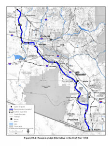 But there also is the option — actually labeled at one point as the preferred one — to have I-11 divide off from I-19 north of Green Valley. Then the road would head west around the San Xavier Reservation and then cut north near Tucson Mountain Park and Saguaro National Park, both points of contention.